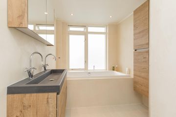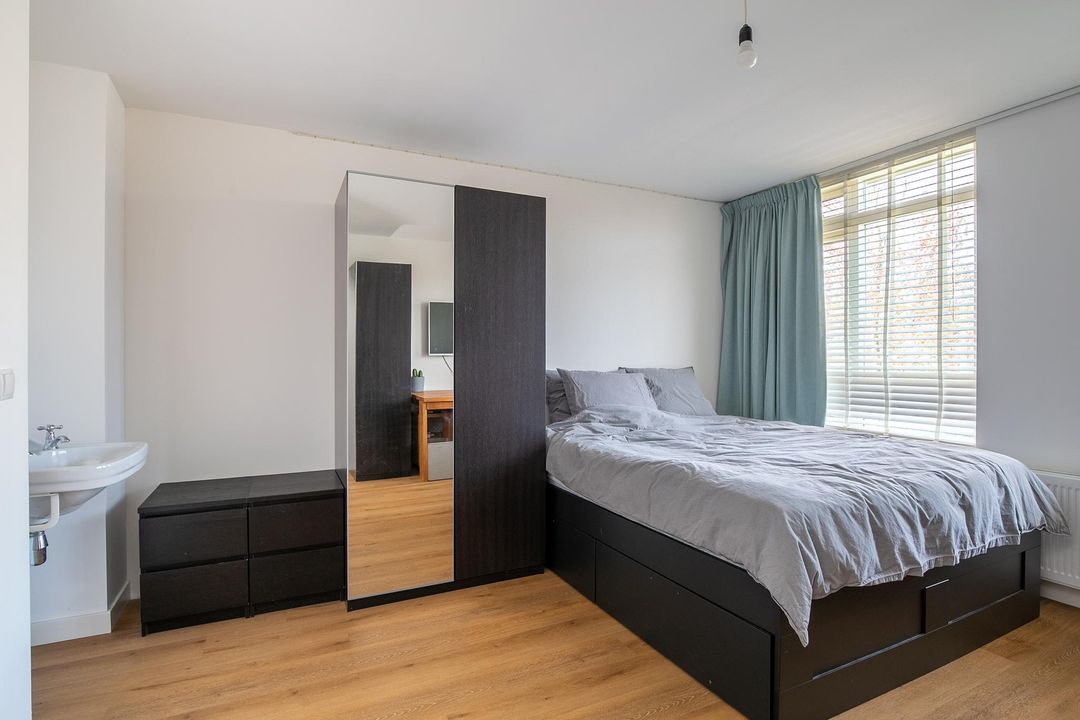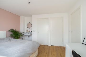 Overloop met toegang tot alle vertrekken, royale slaapkamer aan de voorzijde v.v. groot raam, deur naar het zonnige balkon (v.v. elektrisch bedienbare markiezen), twee vaste inbouwkasten, wastafel, royale wasruimte v.v. aansluiting wasmachine en droger, royale slaapkamer aan de achterzijde v.v. twee ramen, wastafel, fraaie/luxe badkamer met plavuizen vloer v.v. vloerverwarming, (inloop)douche, ligbad en dubbele wastafelmeubel, separate 2e toilet (wandcloset) v.v. vloerverwarming. De gehele verdieping is v.v. een laminaatvloer.
