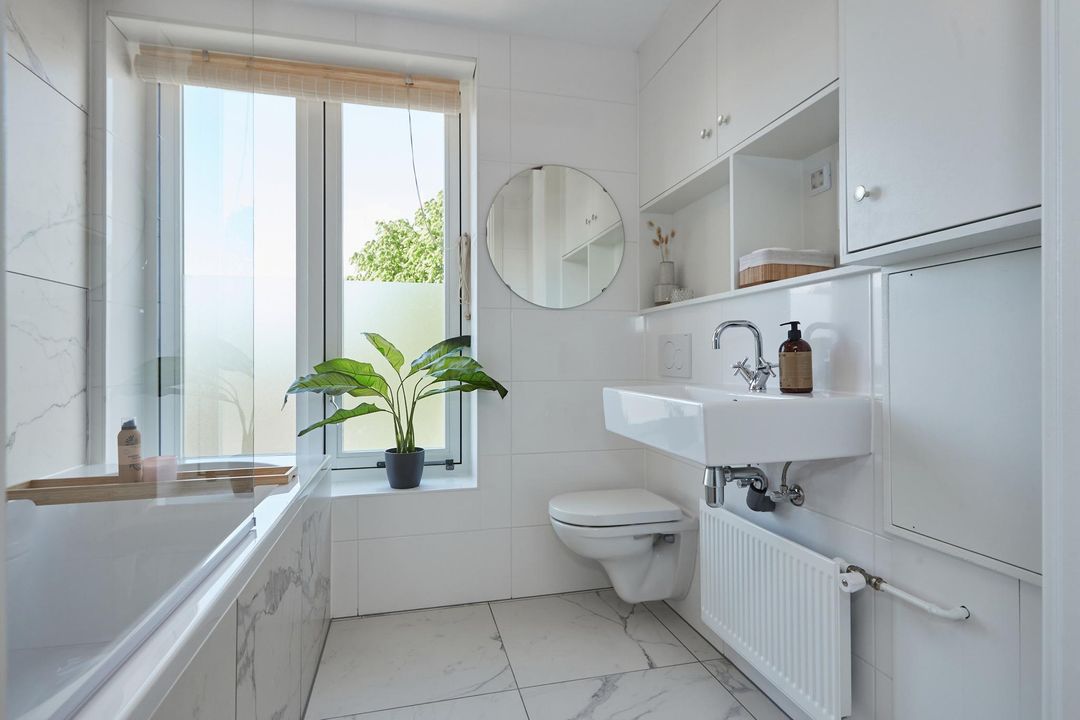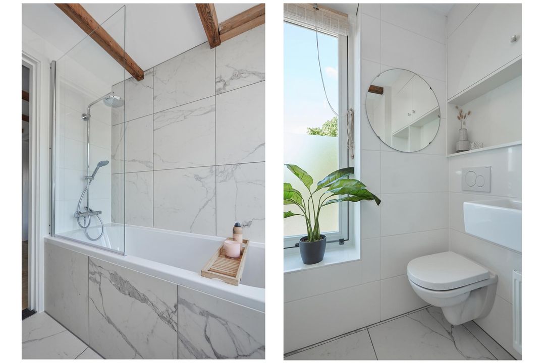 badkamer:	2.41 x 1.89 luxe badkamer, gelegen aan de achterzijde en v.v. ligbad/douche, toilet (wandcloset) wastafel en opstelling cv-combiketel