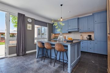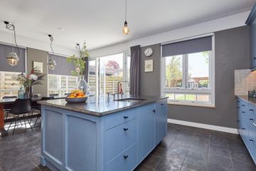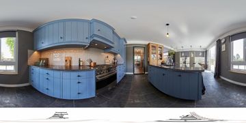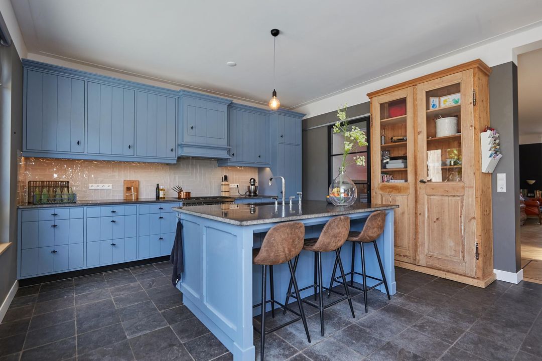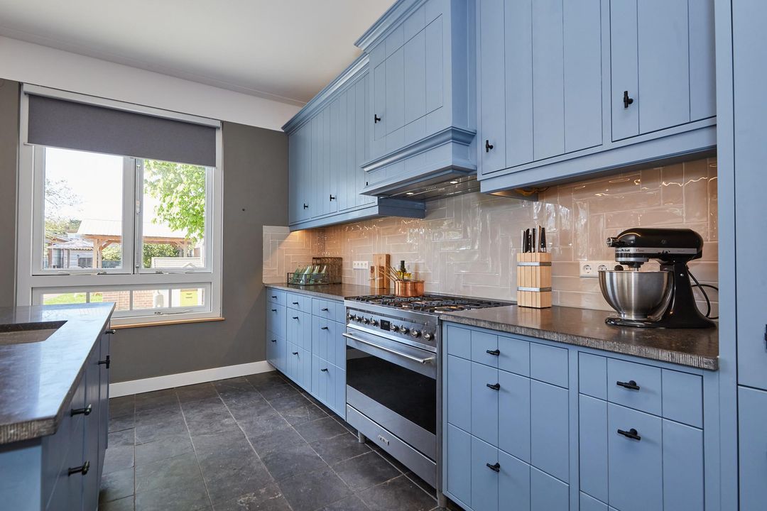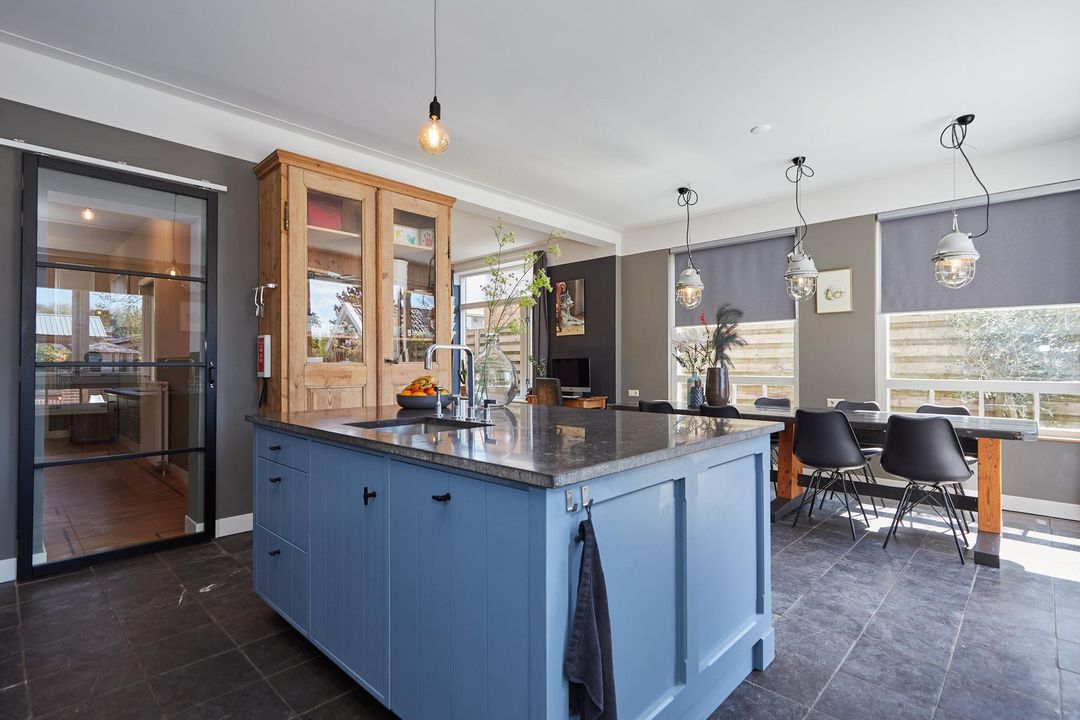woonkeuken: 6.81 x 4.58 royale en lichte uitgebouwde woon/eetkeuken, gehele keuken is handgemaakt v.v. hardstenen vloer met vloerverwarming, zijraam en openslaande deuren met toegang tot de tuin