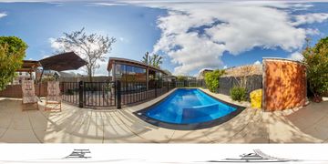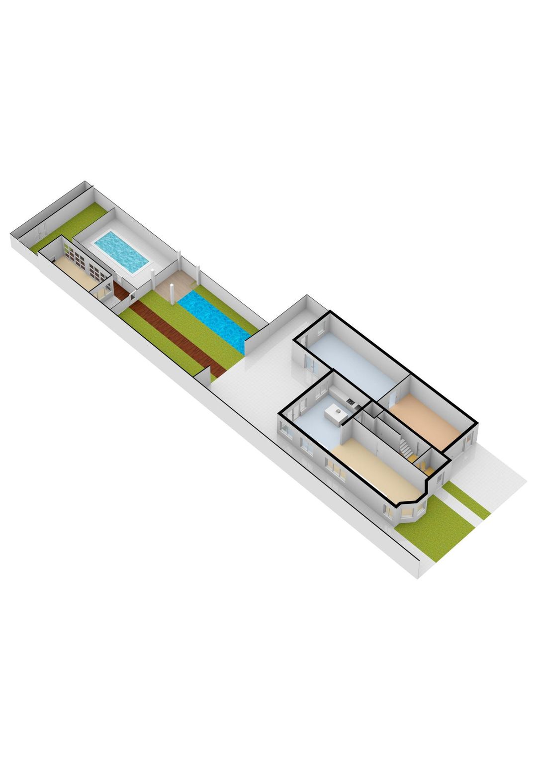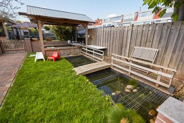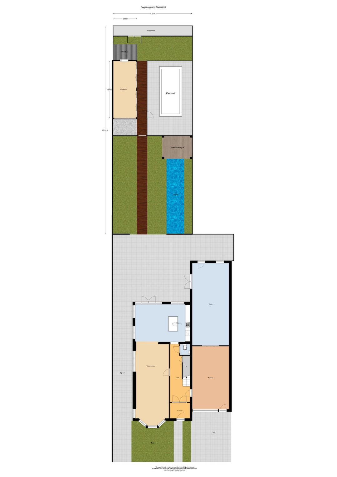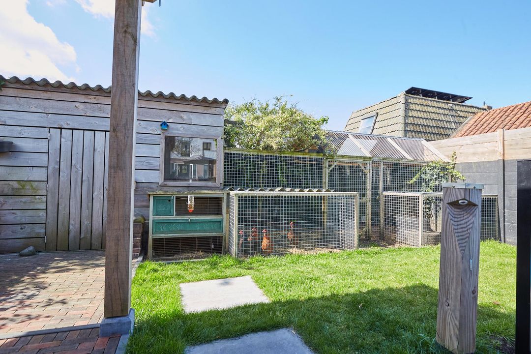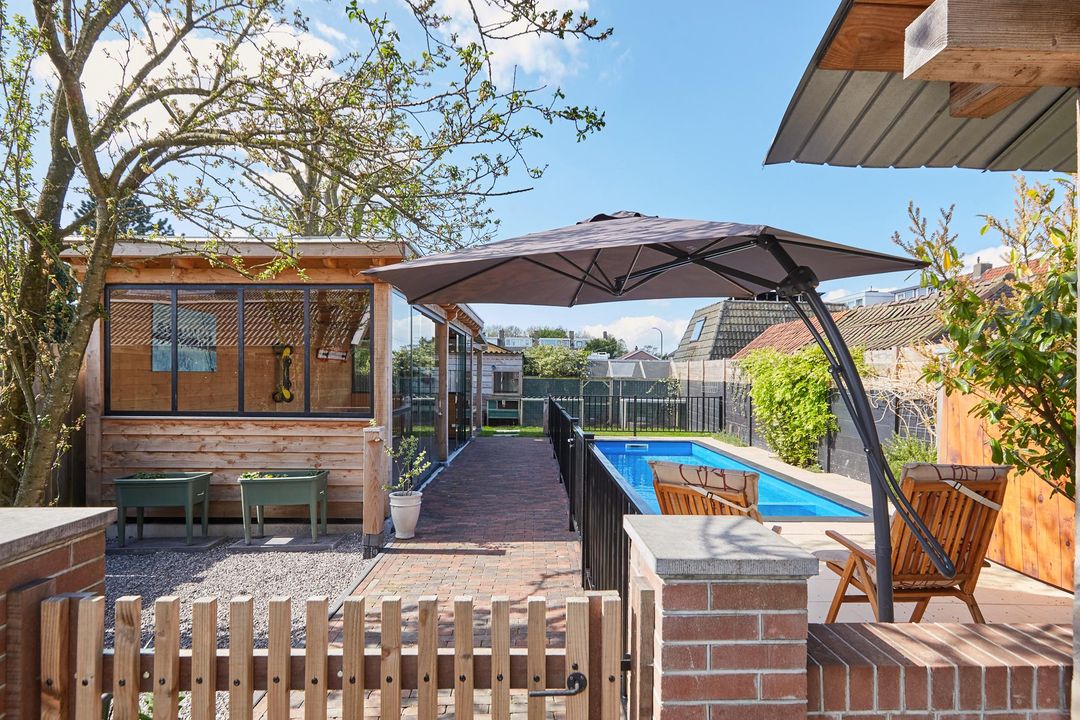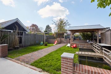 achtertuin:	9.50 x 25.50 diepe aangelegde tuin gelegen op het Zuidwesten, v.v. plantborders, sierbestrating, grasgazon, fruitboom (pruim), vijverpartij, zwembad, overkapping, tuinberging