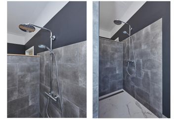 badkamer:	2.01 x 1.71 v.v. toilet (wandcloset), douche en plavuizen vloer
